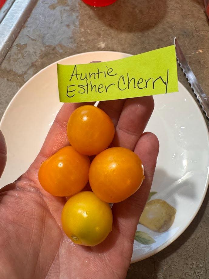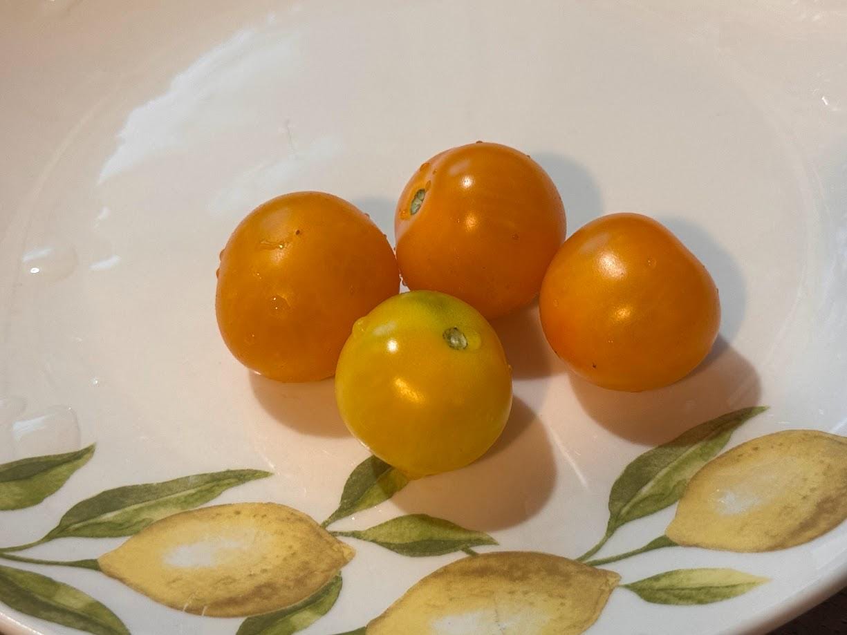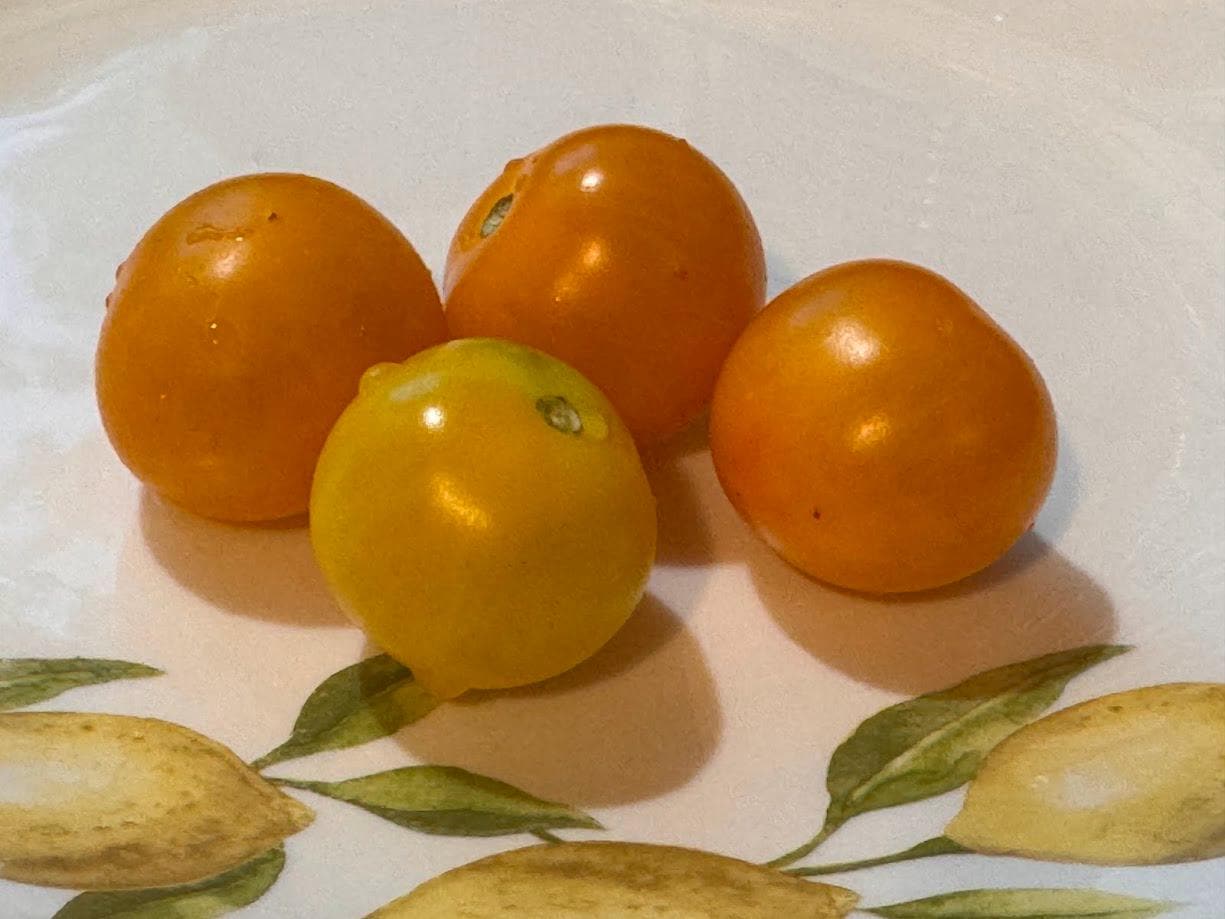 Indeterminate, regular leaf, productive plants. Early season at around 70 days. This plants fill up with large yellow/orange cherry tomatoes. These have a nice, tart, old fashion tomato flavor! Great for snacking!
