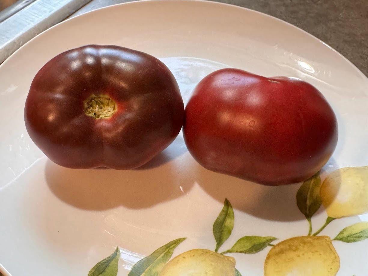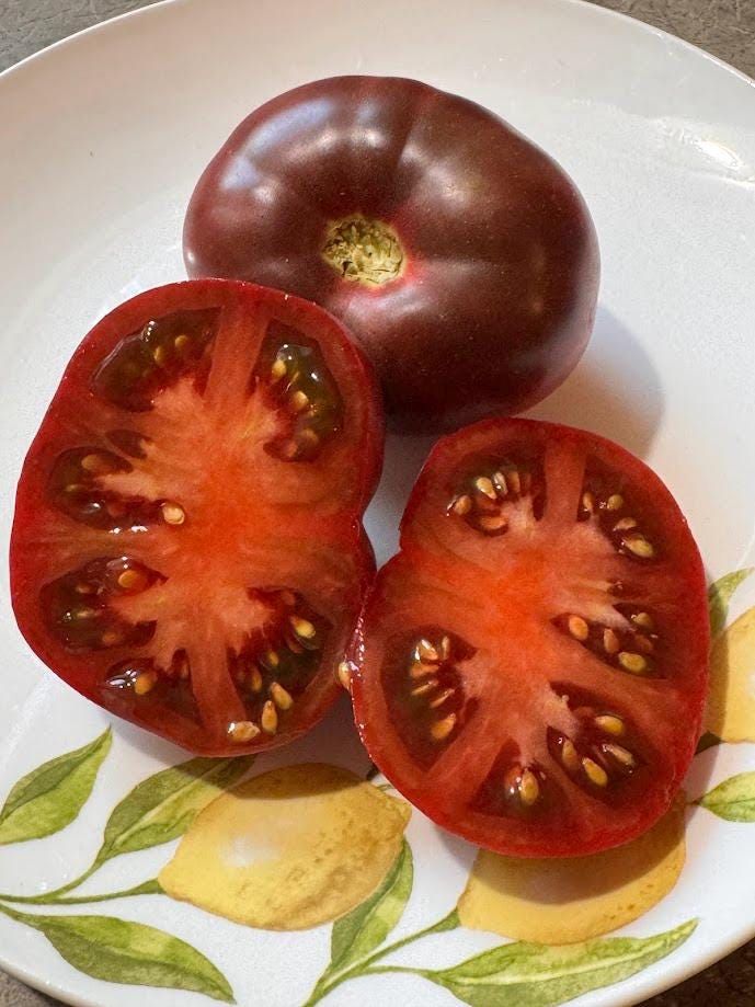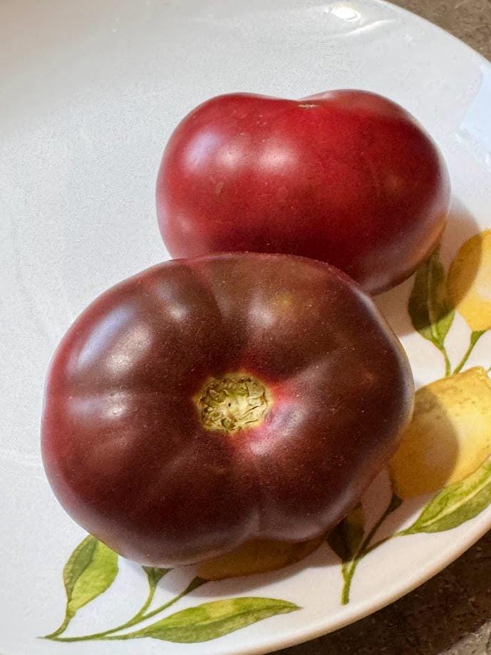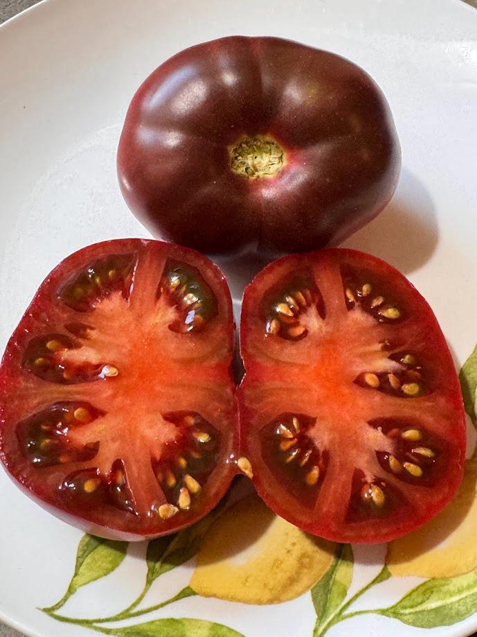 Calvados tomato is a mid-season, exotic tomato variety with flat-round, brown-burgundy fruits. It is known for its smooth, dense, and fleshy texture. The taste is described as sweet with a spicy aroma, and the tomatoes grow in clusters of 2-4.