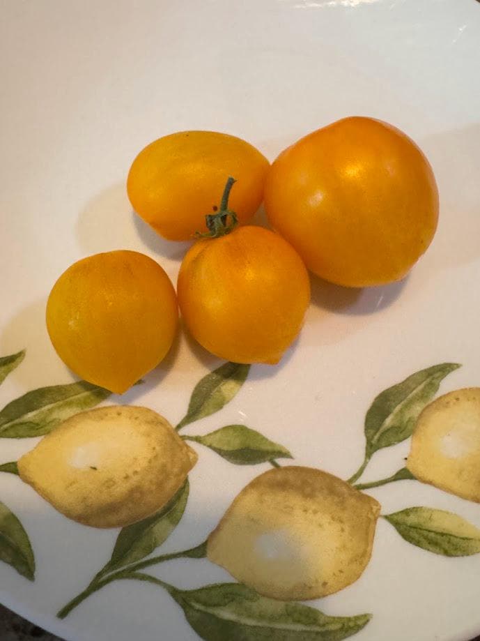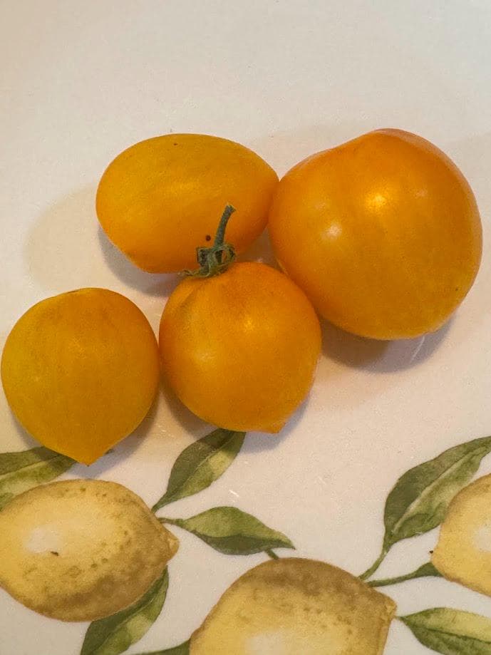 Developed by Blane Horton. This indeterminate plant yields small, round to oval, plum-like fruits with a distinctive appearance: an orange-yellow base adorned with purple-black stripes and blue shoulders. Fruity flavor, mid season.
