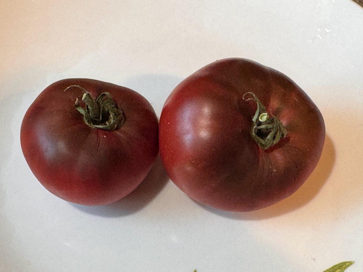 Indeterminate, medium-large deep purple slicers. Great mild flavor. Wonderful for a Blt!