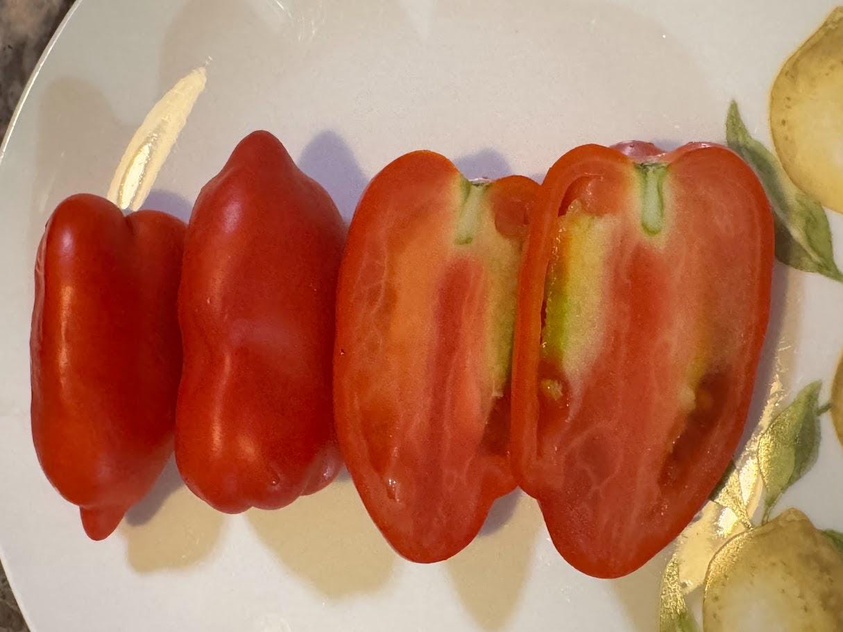 Indeterminate regular leaf. Rare Tuscan heirloom. This is a fabulous paste tomato and so delicious!