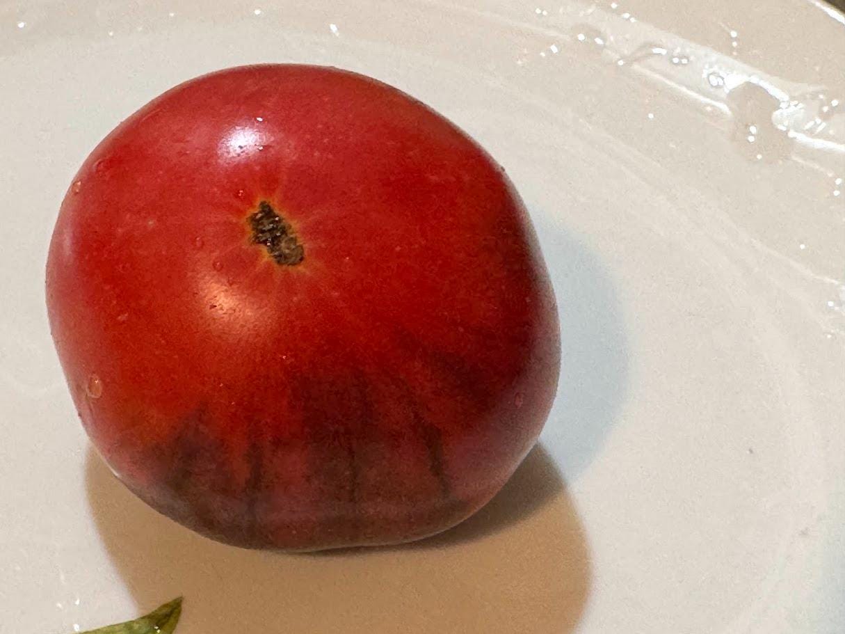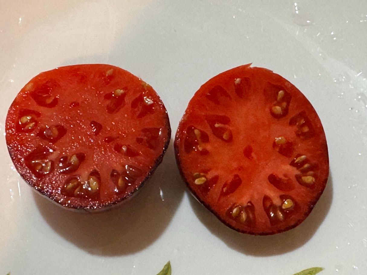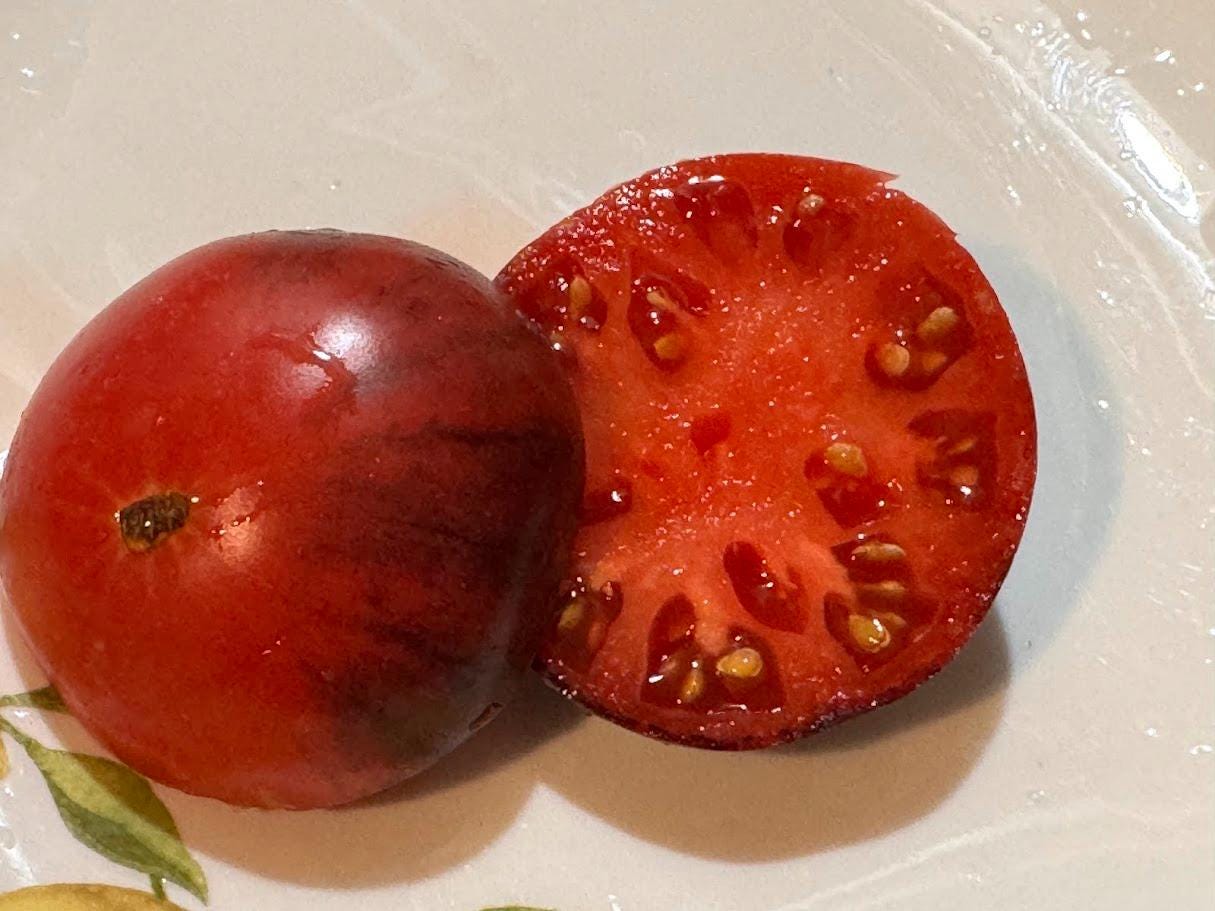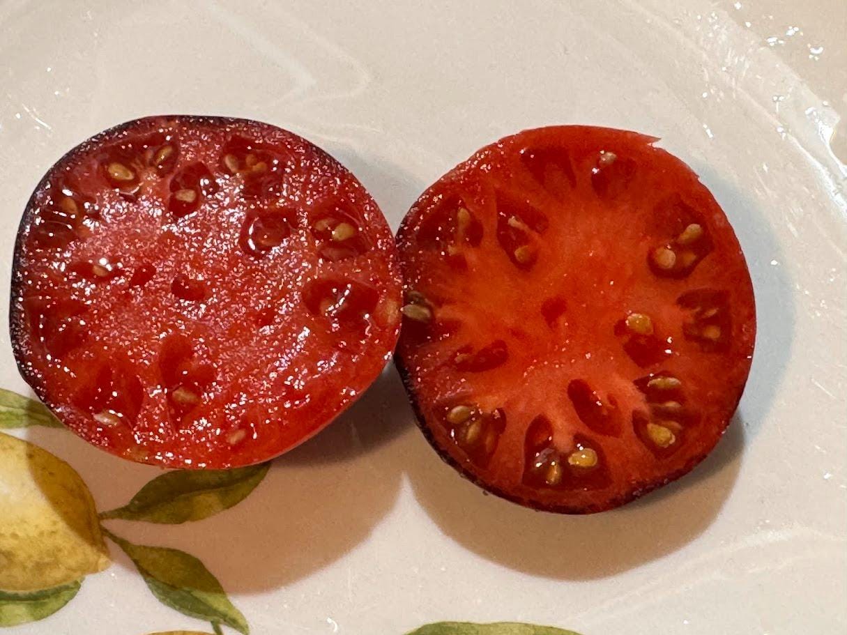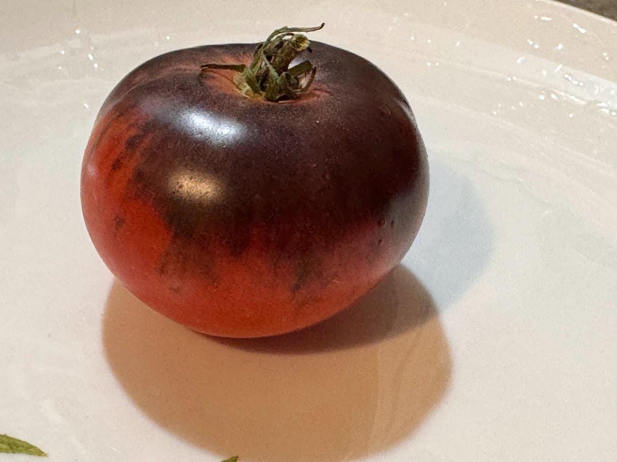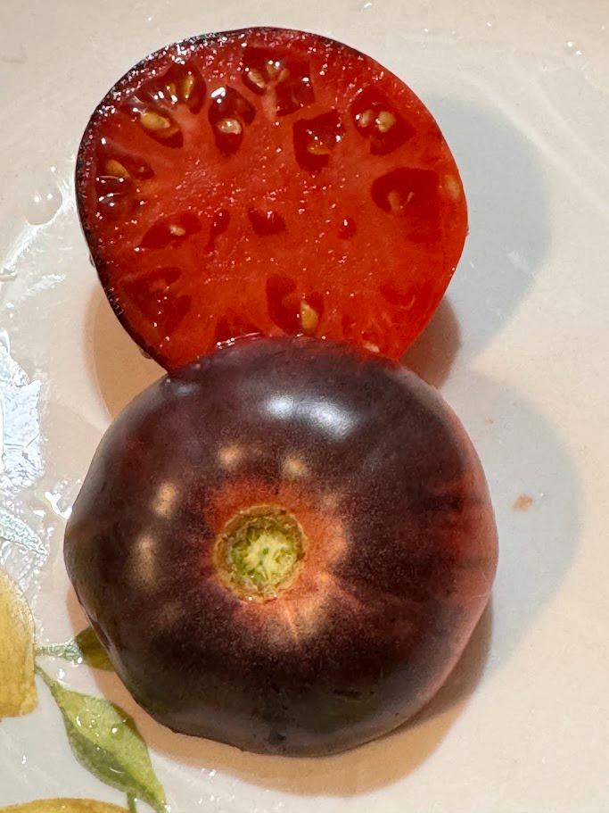 Indeterminate, mid season with regular leaves. Deep purple beefsteaks with a rich flavor