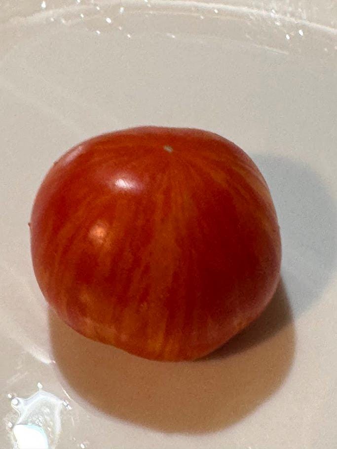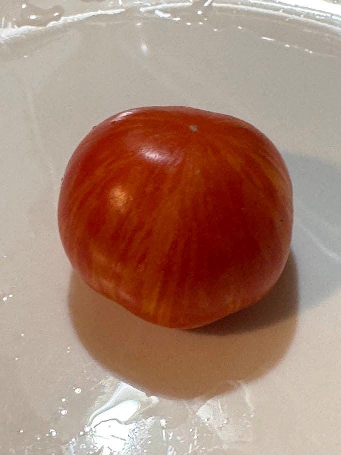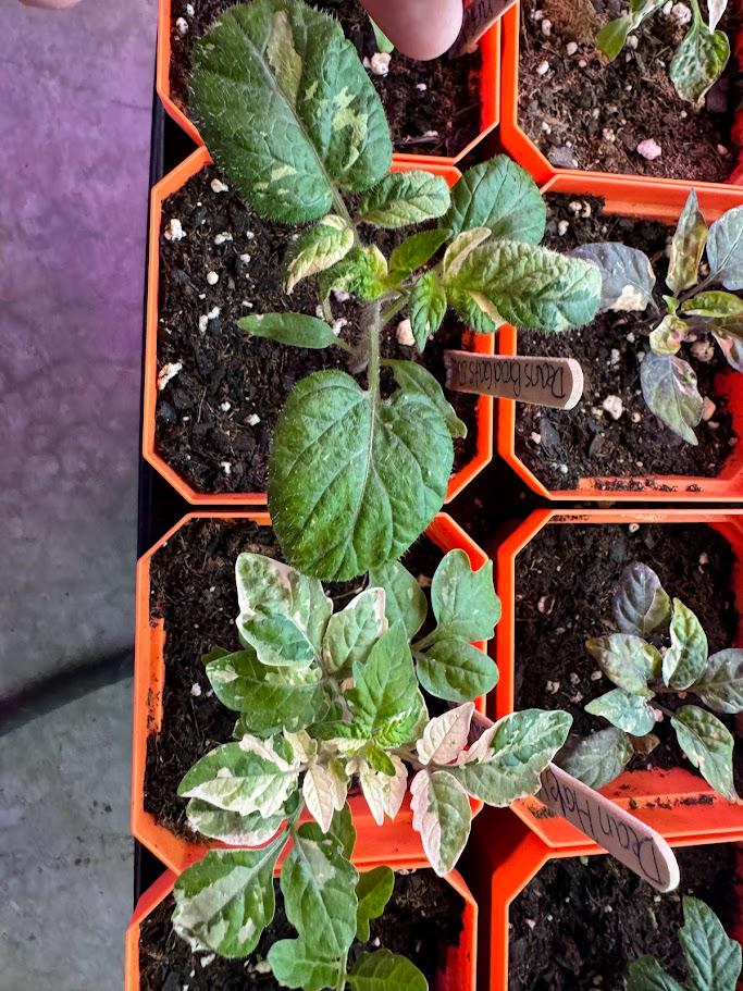 Dean Slater tomato. Dwarf, potato leaf, variegated. Beautiful striped fruits.