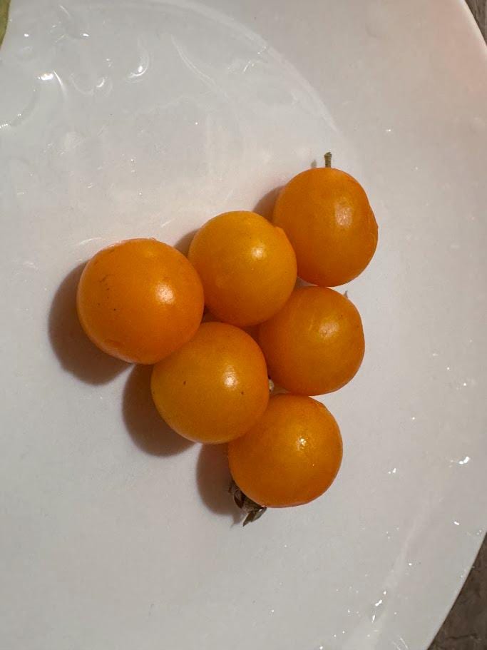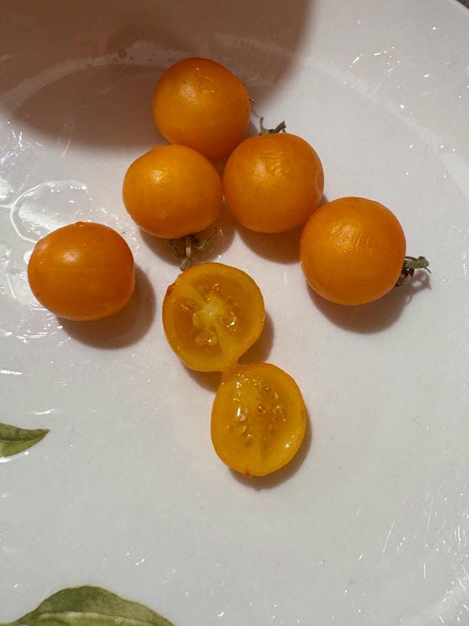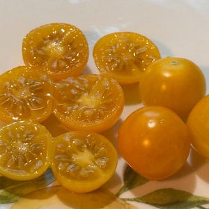 Indeterminate, potato leaf. Yellow Cherry tomatoes with a punch of flavor. Beautiful variegated leaves